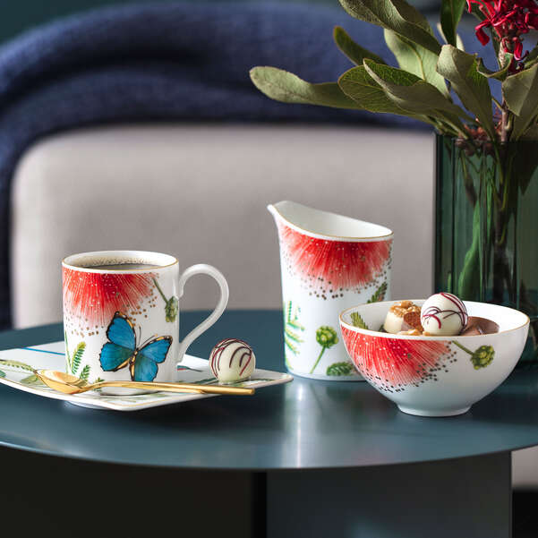 With the Amazonia decor, Villeroy & Boch enhances the popular Modern Grace collection with exotic, bright and colourful rainforest motifs – a real eye-catcher for the table. The stylish small cream jug instantly catches the eye with its floral drawings and large blue butterfly. Enhance your coffee or tea service with this timelessly attractive small milk jug.
