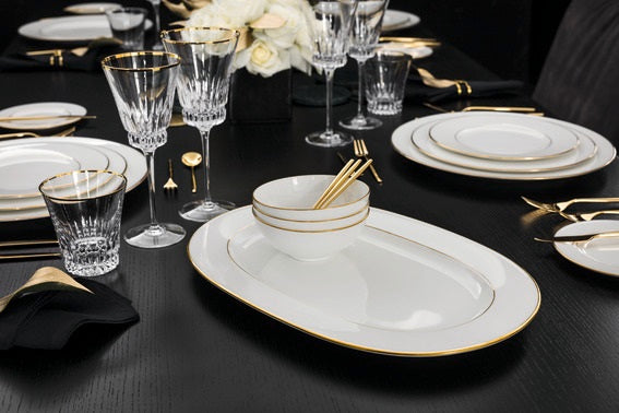 The Anmut Gold collection features hand-painted decorative lines made with fine gold on elegant white, high-quality porcelain. It is precisely this interplay between Premium Bone Porcelain and real gold that gives the collection a sense of style and class. Perfect for anyone who loves both quality and elegance. This flat oval plate is perfect for serving a wide variety of delicacies – and the brilliant pattern will remain a lasting feast for the eyes thanks to "Inglaze Gold" technology. Make your table more beautiful with the timeless charm of fine gold.